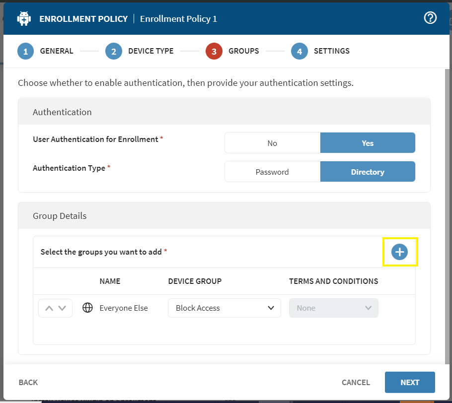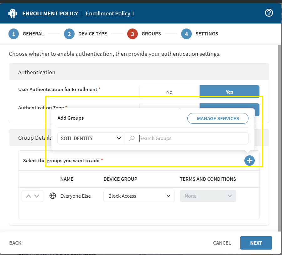 - SOTI Identity is used as an authentication option in Enrollment Policies/Add Device rules.
