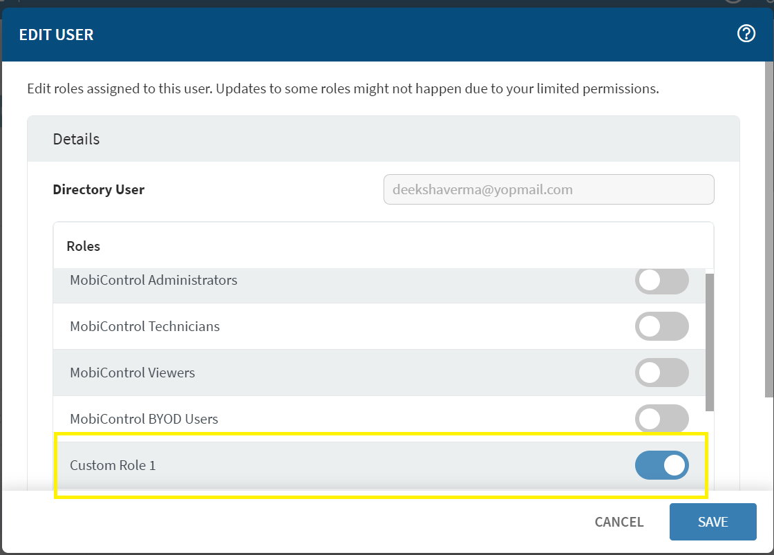 If you are using a SOTI MobiControl version earlier than 15.6.0, SOTI Identity provides an option to manage and assign roles for the SOTI MobiControl application: