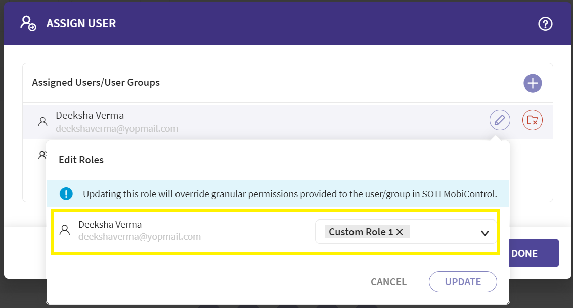 - Remove the "Custom Role 1" and add all the SOTI Identity user groups that were associated with the “Custom Role 1” SOTI Identity role prior to upgrade: