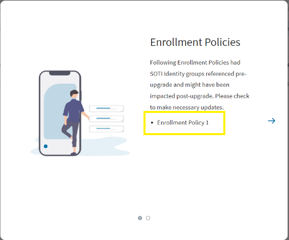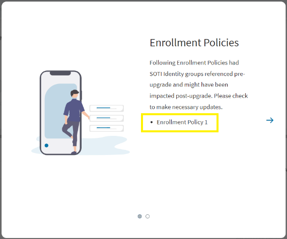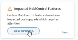- In the SOTI MobiControl Web Console when the user logs in for the first time post-upgrade, the user will see a mandatory announcement indicating that there are some impacted features post-upgrade: