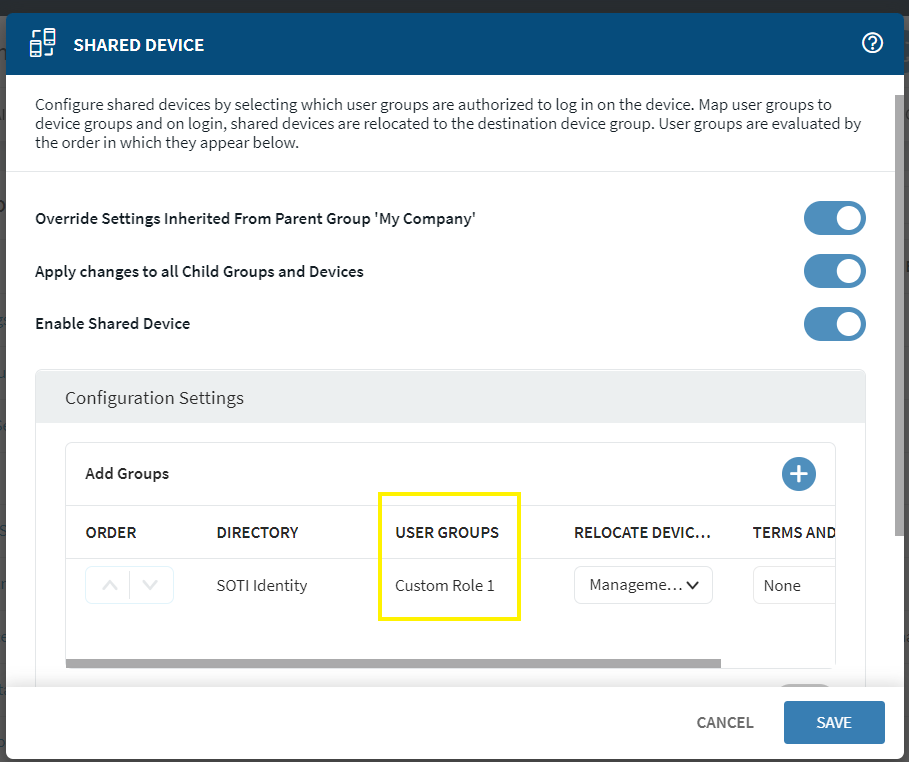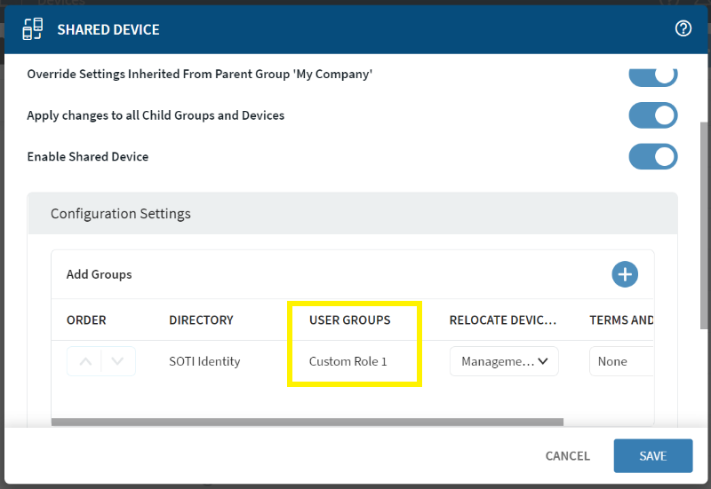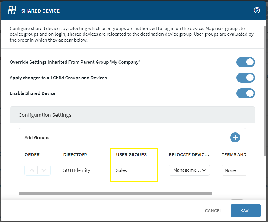 - SOTI Identity user groups are used in Shared Device Groups configuration