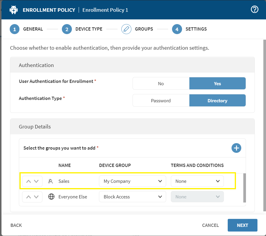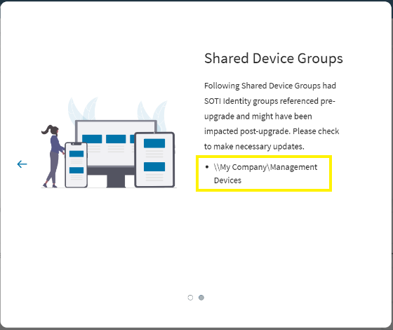 As a result of the above impacts, if you were using SOTI Identity for device side authentication through Add Device rules or Enrollment policies, or if you had mapped SOTI Identity user groups in the MobiControl Shared Device configuration, you must remap these in MobiControl after upgrading.