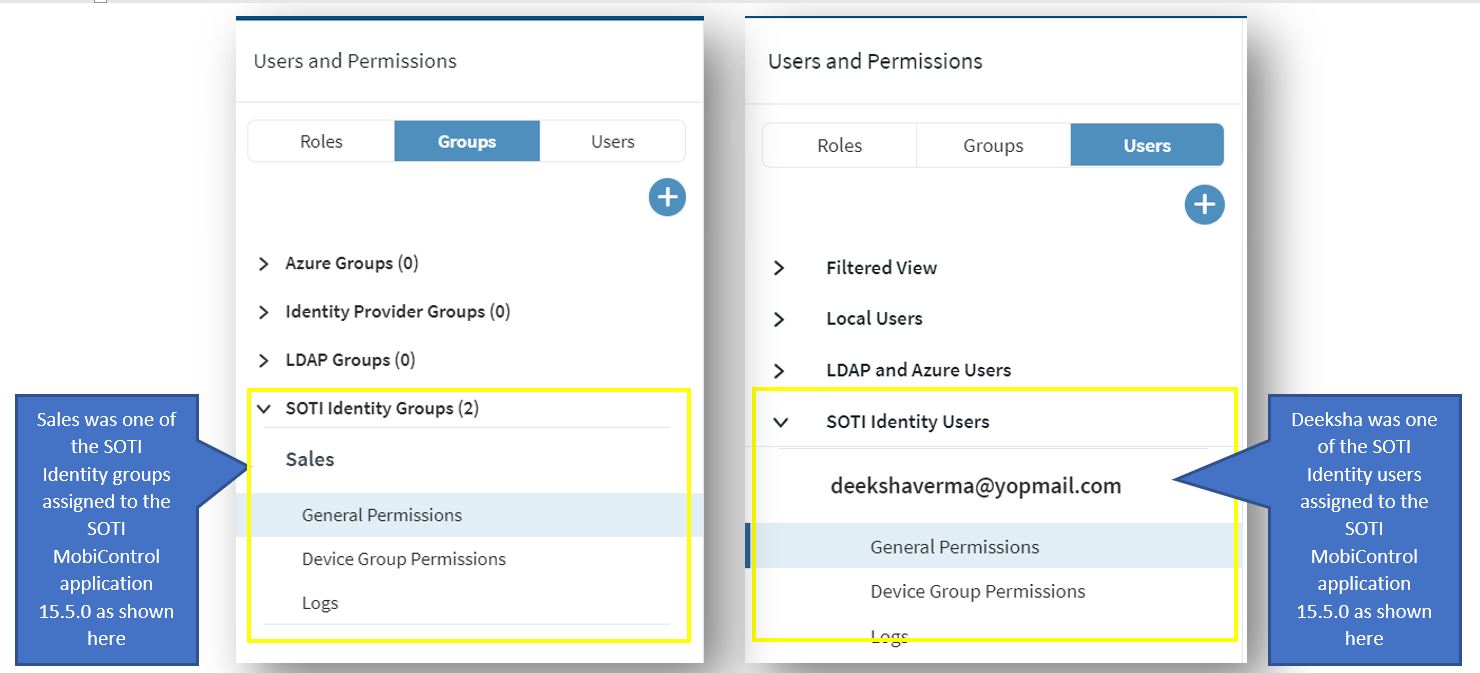 - SOTI Identity Roles that appeared in SOTI MobiControl as SOTI Identity Groups in the Groups tab within Users and Permissions section will no longer be listed there. The SOTI Identity Roles will be migrated to SOTI MobiControl Roles and will appear under the Roles tab instead. The migration process will preserve the set of permissions associated with each role.: