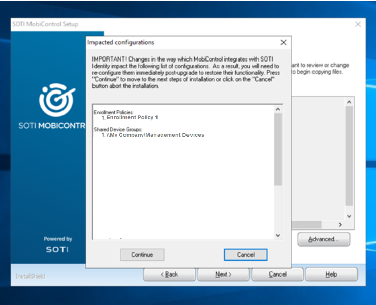 - The administrator will be notified within the installation process about the impacted areas. The names of the policies/rules in the case of Enrollment, Add Device Rule, Profiles, Apps and Compliance and the device group path in the case of Shared Device Group configuration will be shown: