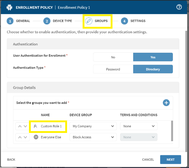 - Click the Groups tab of the policy. You should see the “Custom Role 1” role (which was a SOTI Identity role prior to upgrade) associated here with the policy: