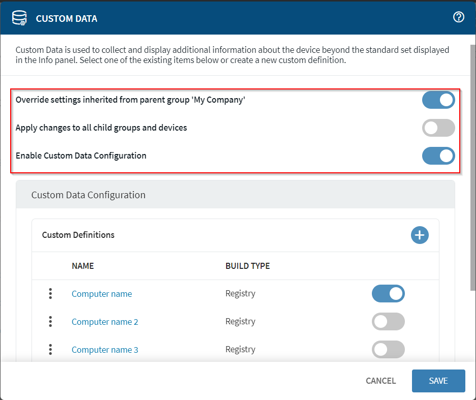 4. Toggle on the options Override settings inherited from parent group 'My Company' and Enable Custom Data Configuration.