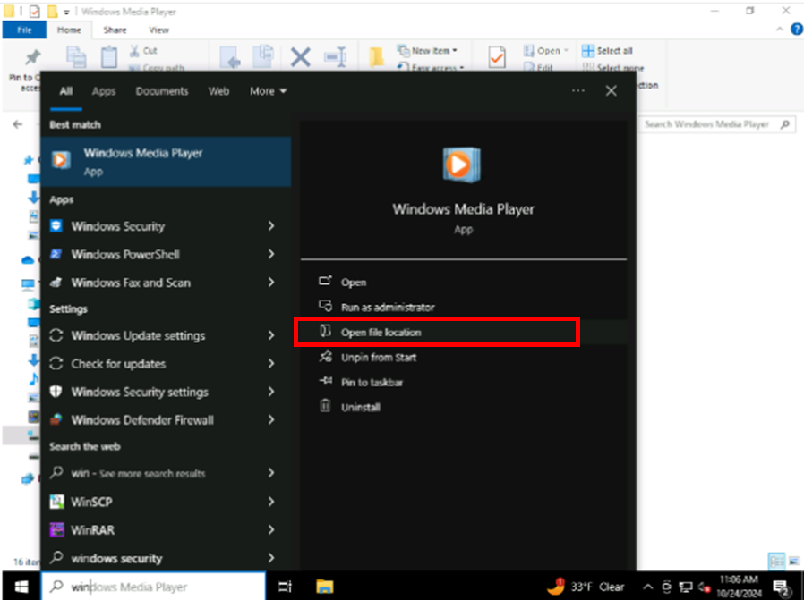 C:\Program Files (x86)\Windows Media Player\wmplayer.exe. - Right-click on the application. Then, select Pin to Start.