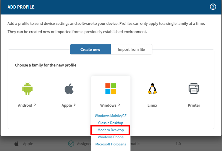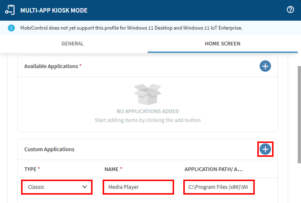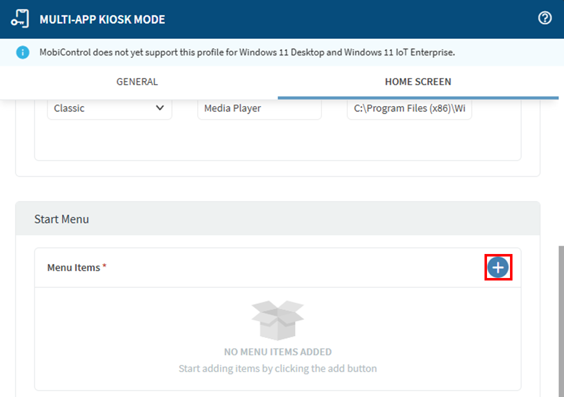 C:\ProgramData\Microsoft\Windows\Start Menu\Programs\Accessories\Windows Media Player.lnk. - In SOTI MobiControl, navigate to Profiles > New Profile > Modern Desktop.