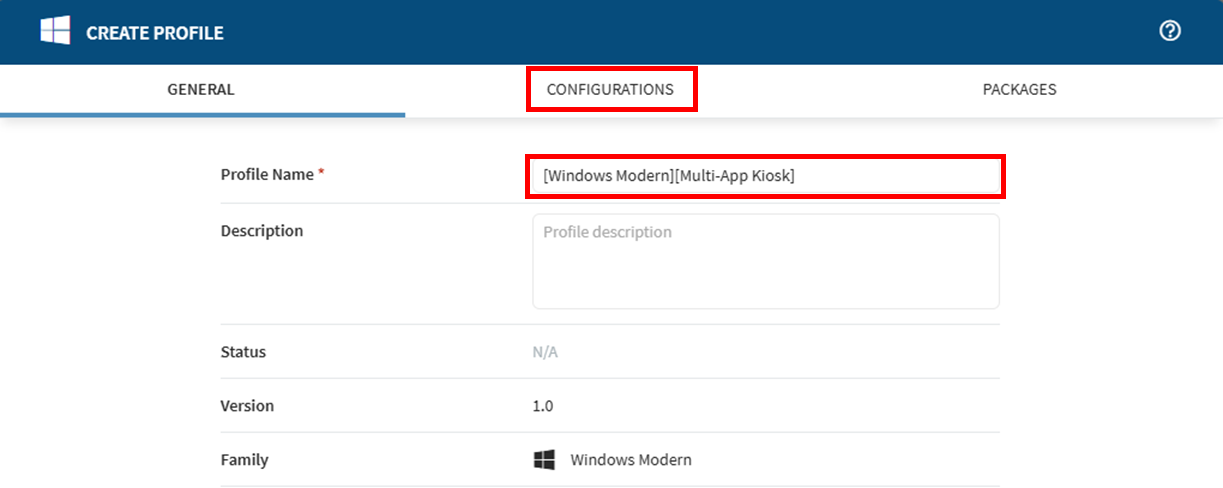 - Give the profile a descriptive name and proceed to the Configurations tab.
