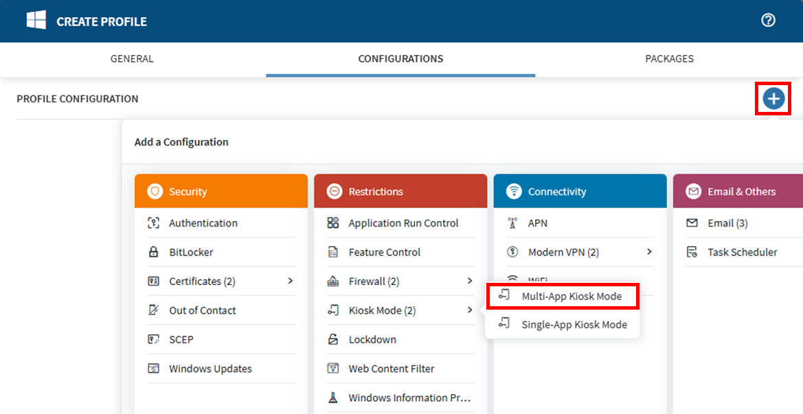 - Select (+) Add > Kiosk Mode (2) > Multi-App Kiosk Mode to add the Multi-App Kiosk configuration.