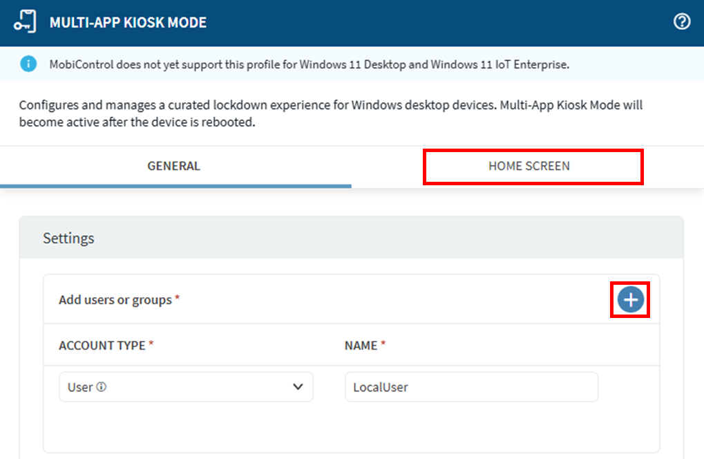 - Select (+) Add to add users or groups. Select an Account Type. In this example, the profile is assigned to a local user named LocalUser. Then, navigate to the Home Screen tab.