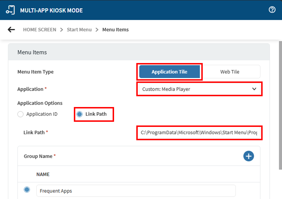 - Select Application Tile as the Menu Item Type. Then, select the application from the Application dropdown. Toggle on Link Path in the Application Options and paste the shortcut path copied earlier.