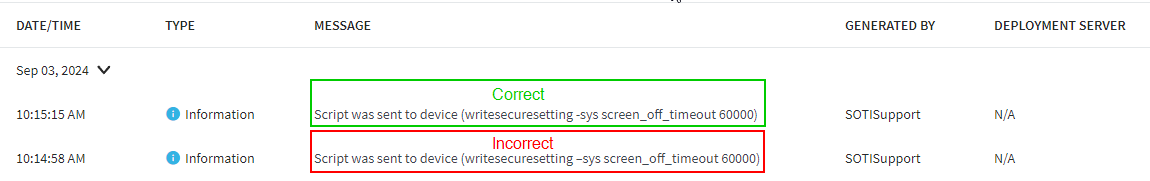 To change the device timeout value, use the "writesecuresetting –sys screen_off_timeout 60000" script to change the screen timeout values (the number value is in milliseconds). However, after sending this script to the device, the screen timeout does not change and there are no error messages in the device logs to indicate that the script is not supported or that the script syntax is incorrect.