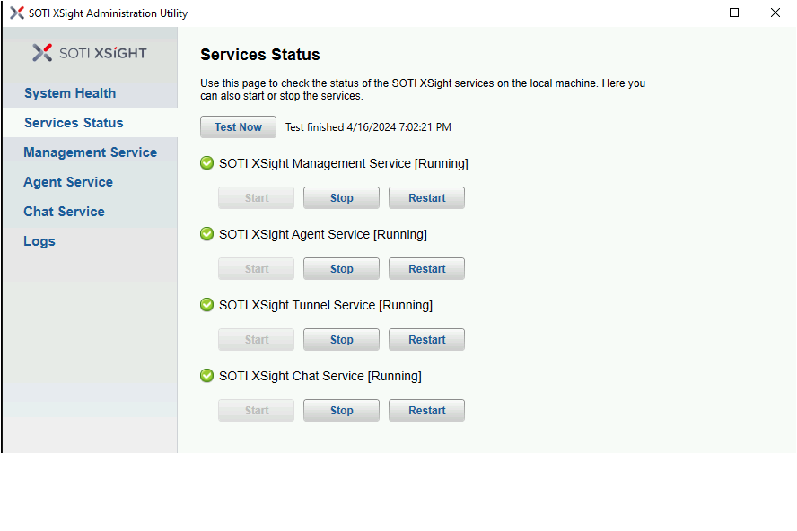 3. Confirm all services are operational. If any services are halted, attempt to restart them, particularly the SOTI XSight Chat service, which is essential for Live Support functionality.