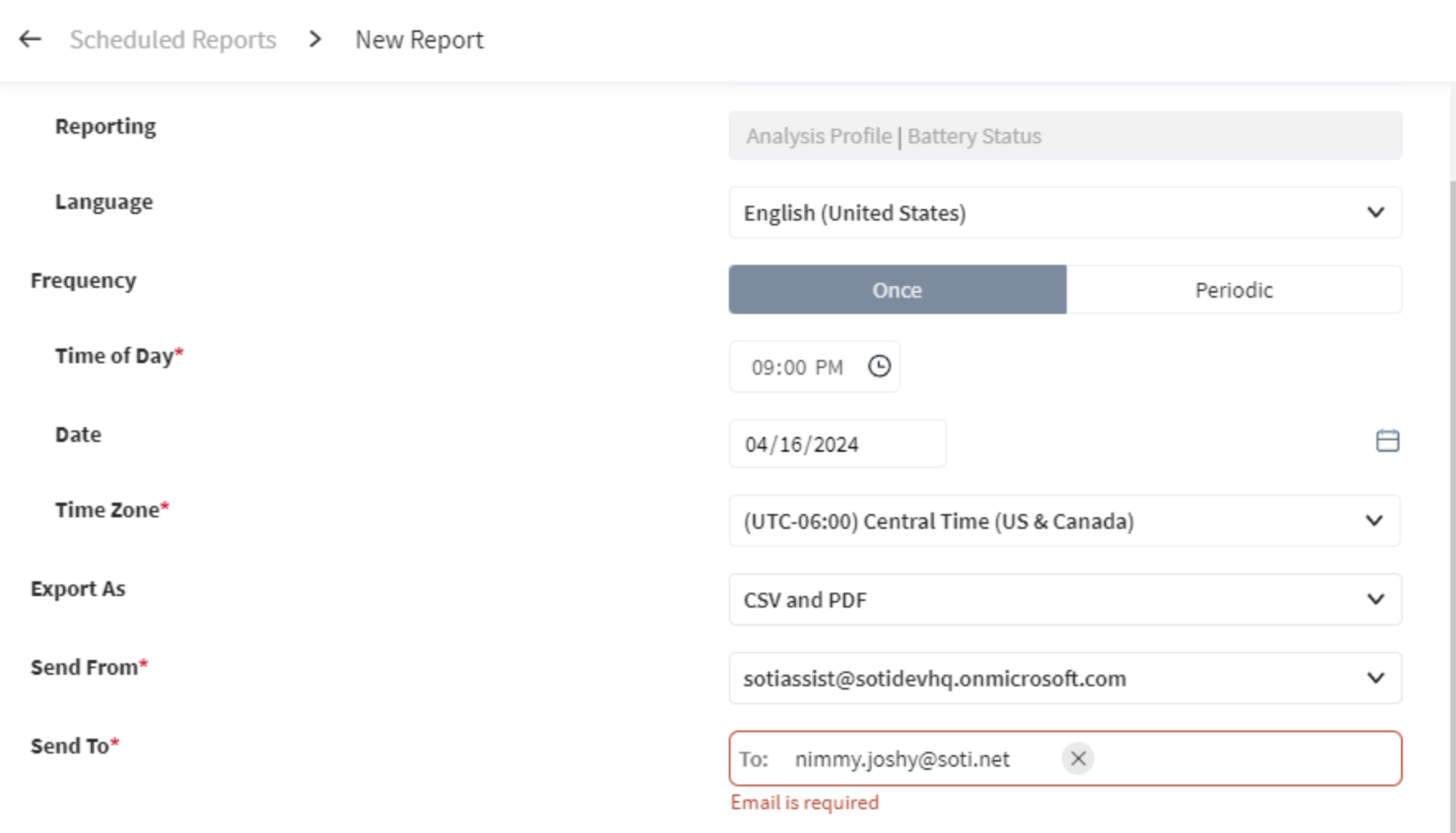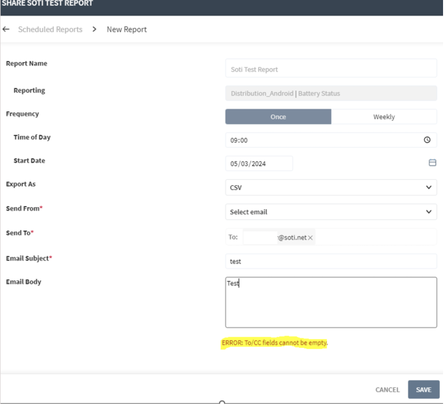 SOTI XSight displays an error message that reads "Email is required" when setting up an email recipient for a scheduled report. This occurs when selecting Save without first pressing the Enter key.