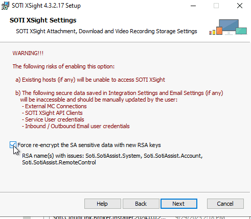 - Continue through the repair as normal. However, when the installer asks about RSA keys, select "Force re-encrypt the SA sensitive data with new RSA keys."