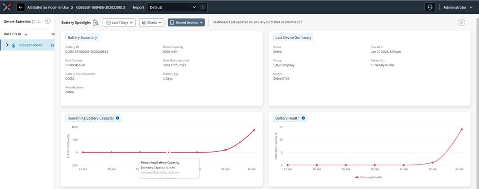 Previous versions of the SOTI XSight 2024.0.1.3 XT Socket for Zebra smart batteries for Power Precision provide values that impact the smart battery dashboard and the battery spotlight. The Remaining Battery Capacity will consistently appear in a negative format when calculating its moving average. This is due to the current capacity values being unavailable, how it reports data to the XT Socket, and how it is displayed to the dashboard.
